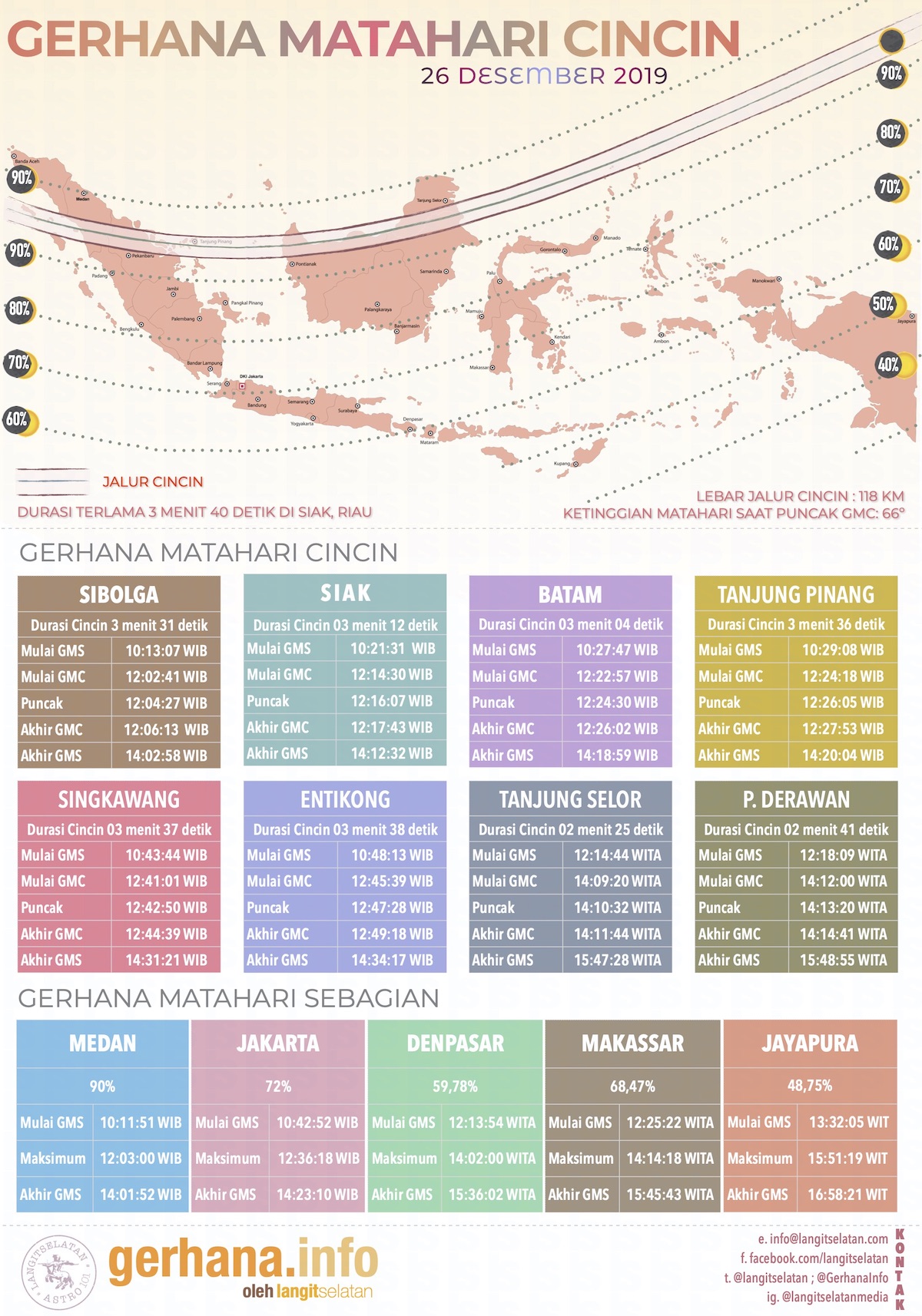 Pada tanggal 26 Desember 2019, Indonesia akan dilintasi Gerhana Matahari. Untuk itu, kami menyediakan informasi waktu dan lintasan gerhana dalam bentuk infografik.
