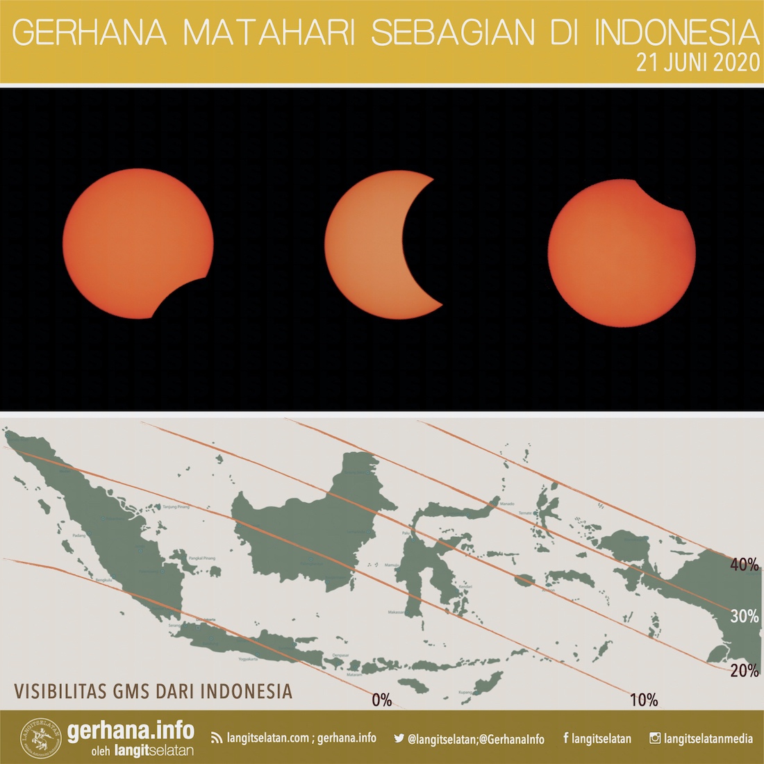 Pada tanggal 21 Juni 2020, Indonesia akan dilintasi Gerhana Matahari Sebagian. Untuk itu, kami menyediakan informasi waktu dan kenampakan gerhana dalam bentuk infografik.