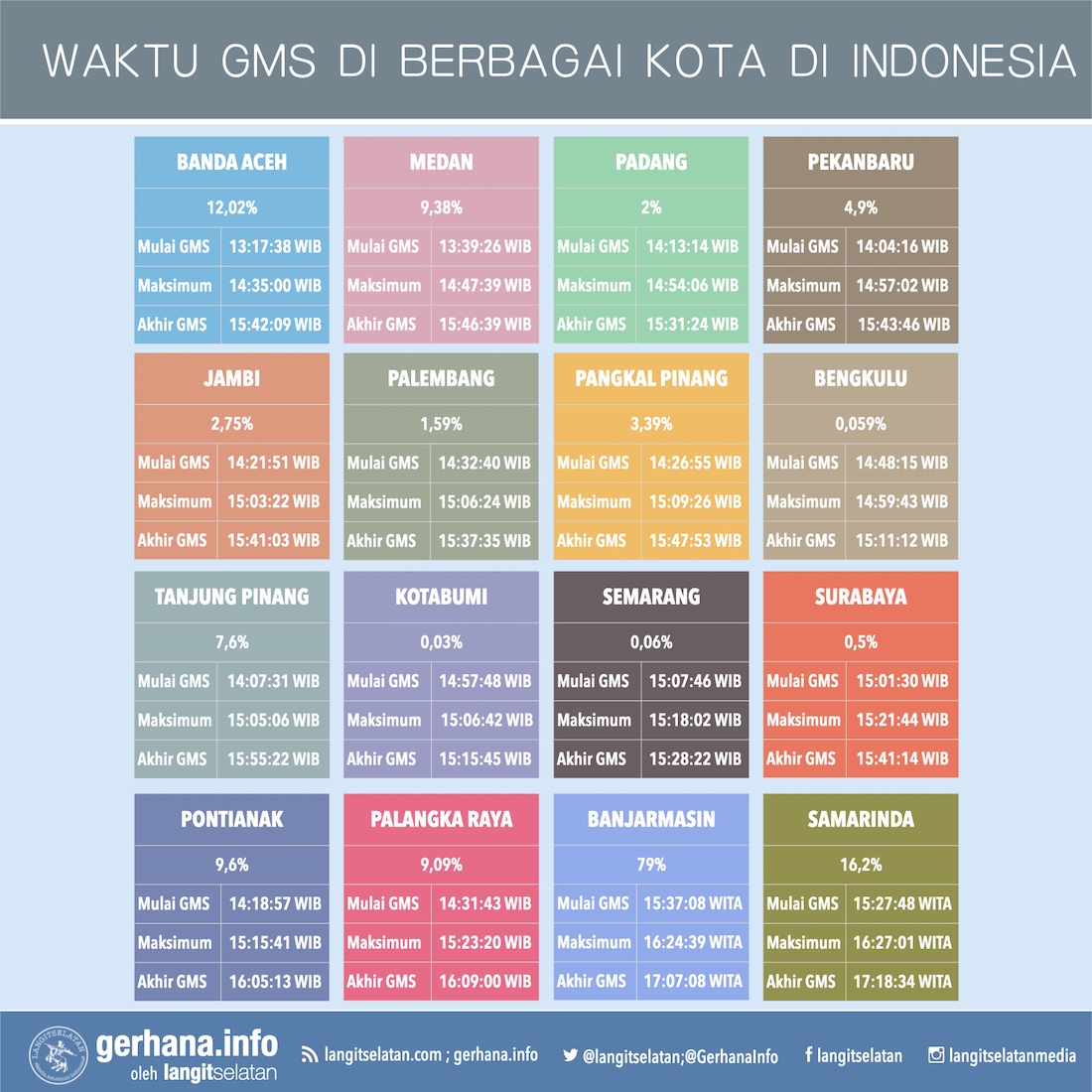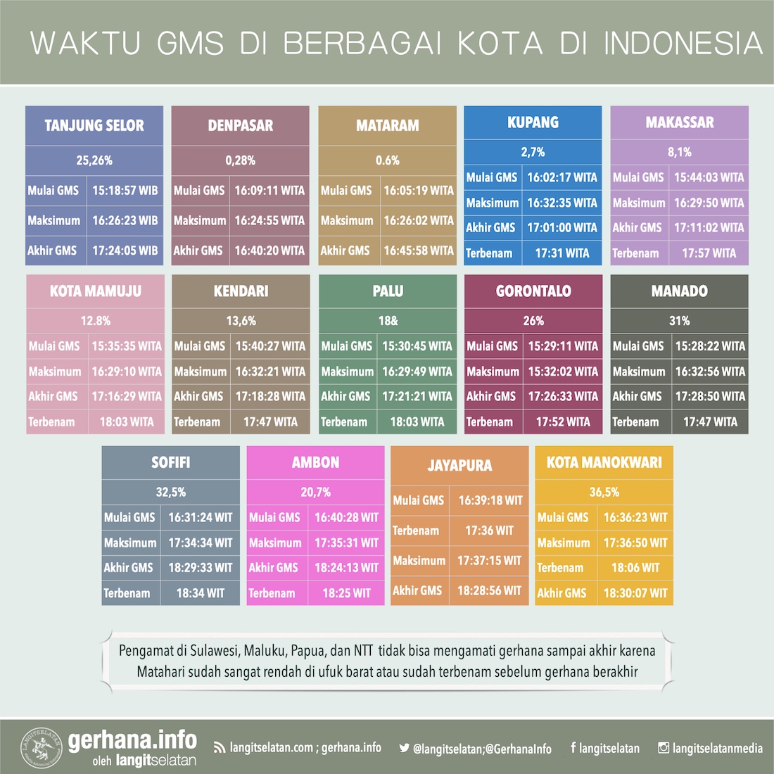 Untuk mengetahui waktu Gerhana Matahari Sebagian dengan patokan Ibukota Propinsi bisa dilihat pada infografik berikut. Dalam Infografik ini, Bandar Lampung digantikan oleh Kotabumi karena kota Bandar Lampur di Lampung tidak dilintasi Gerhana Matahari Sebagian.
