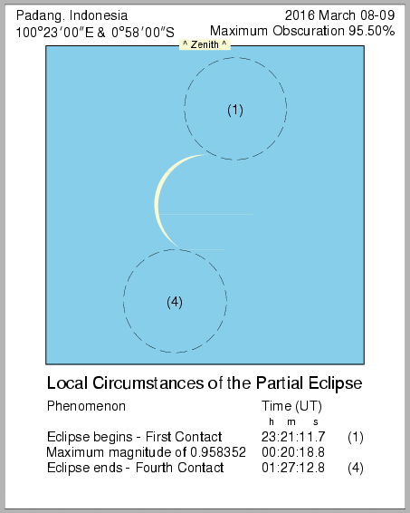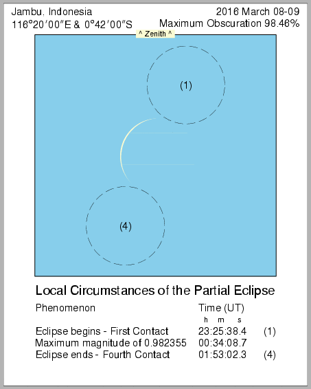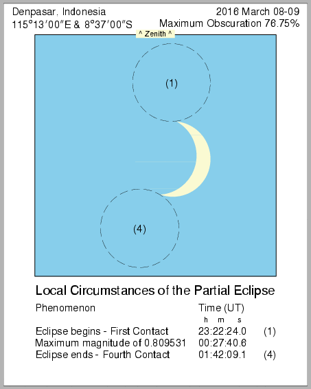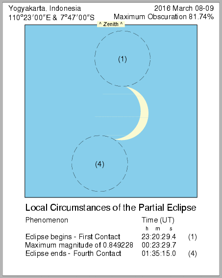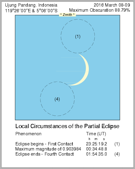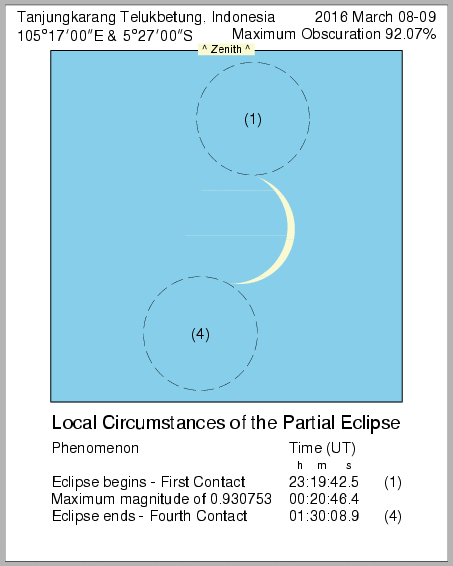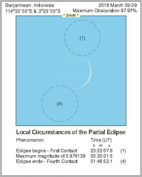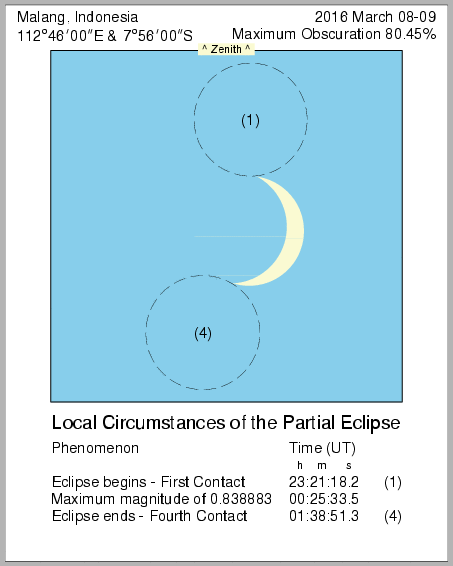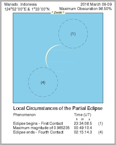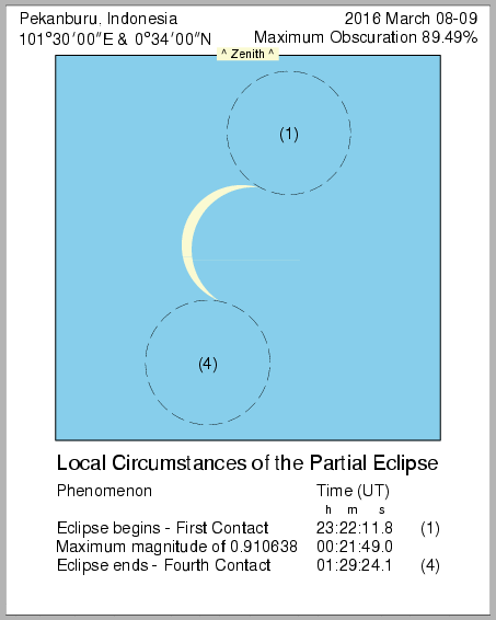 In this page we provide images from 9 March 2016 Total Solar Eclipse simulation from various location in Indonesia. Contact time for the solar eclipse also provided in each image.